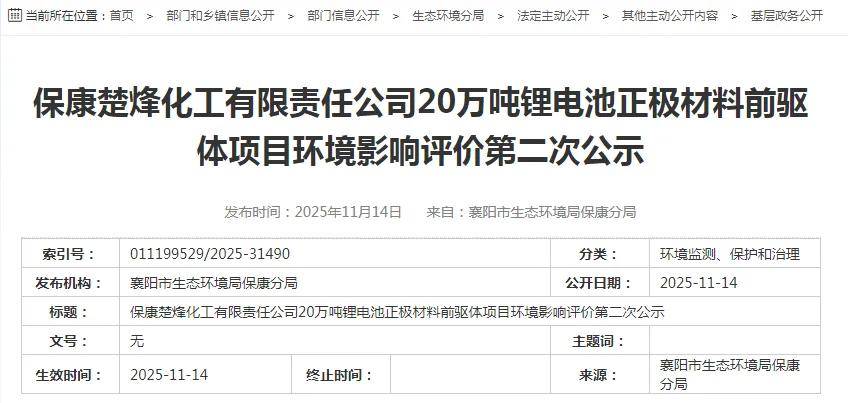 日前,襄阳市生态情况局保康分局宣告了《保康楚烽化工有限职守公司20万吨锂电池正极资料先驱体项目情况影响评议第二次公示》,象征着又少睹十万吨磷酸铁锂产能即将落地湖北。
